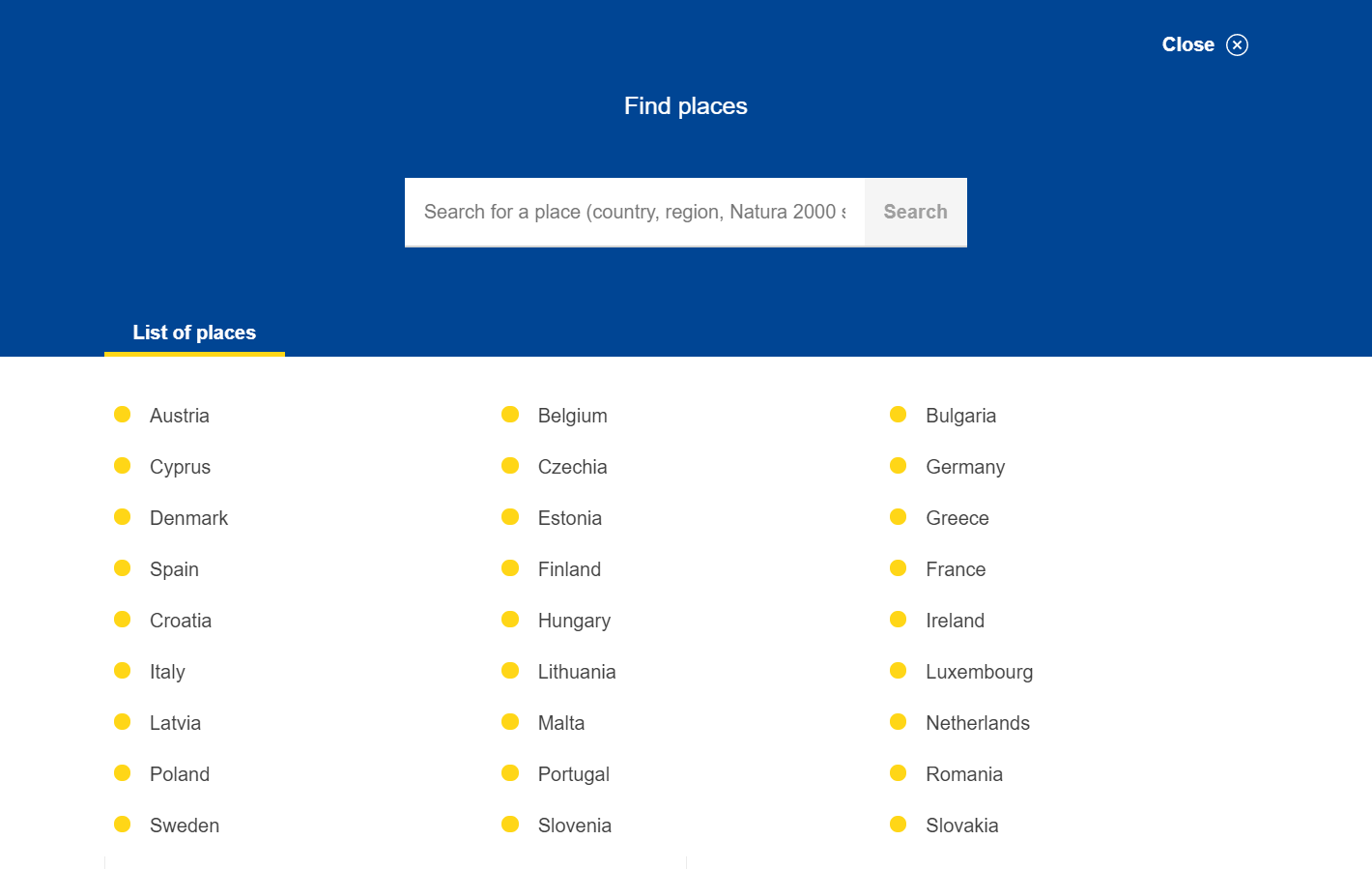 The webtool all offers a hierarchical list of countries and sites which can be accessed by first selecting a country, then a region and finally a site. Access to the map view is possible from any of the three levels: country, region or site.